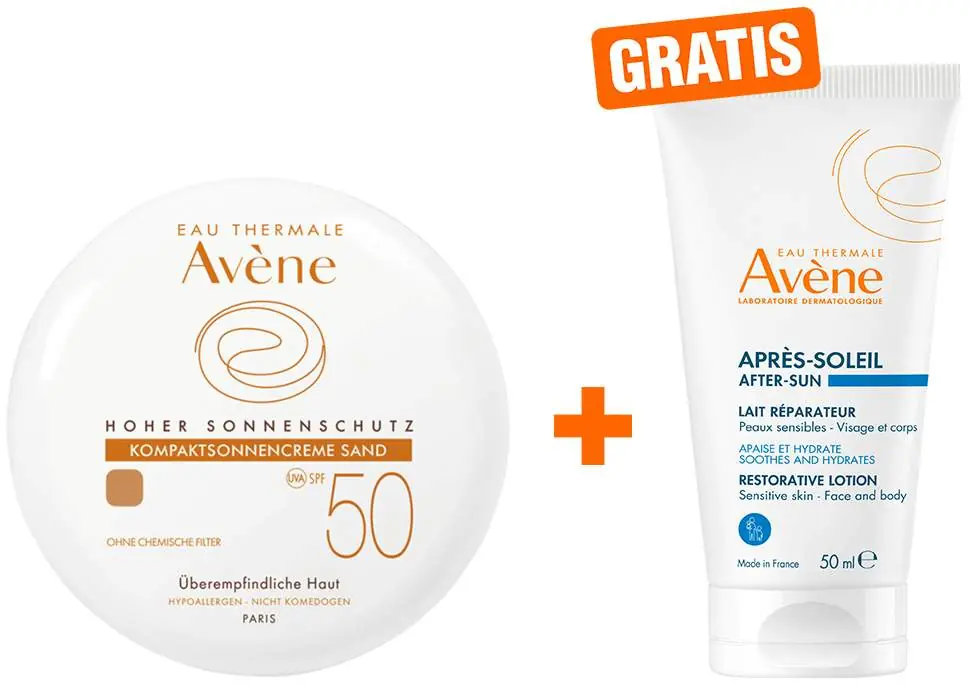 Avene Kompaktsonnencreme SPF 50 sand 10 g Creme + gratis Repair – Lotion nach der Sonne 50 ml Markenware