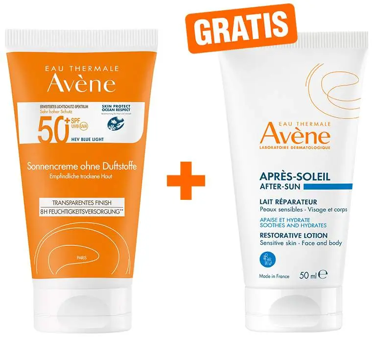 Avene Sonnencreme SPF 50+ ohne Duftstoffe 50 ml + gratis Repair – Lotion nach der Sonne 50 ml Saisonangebot