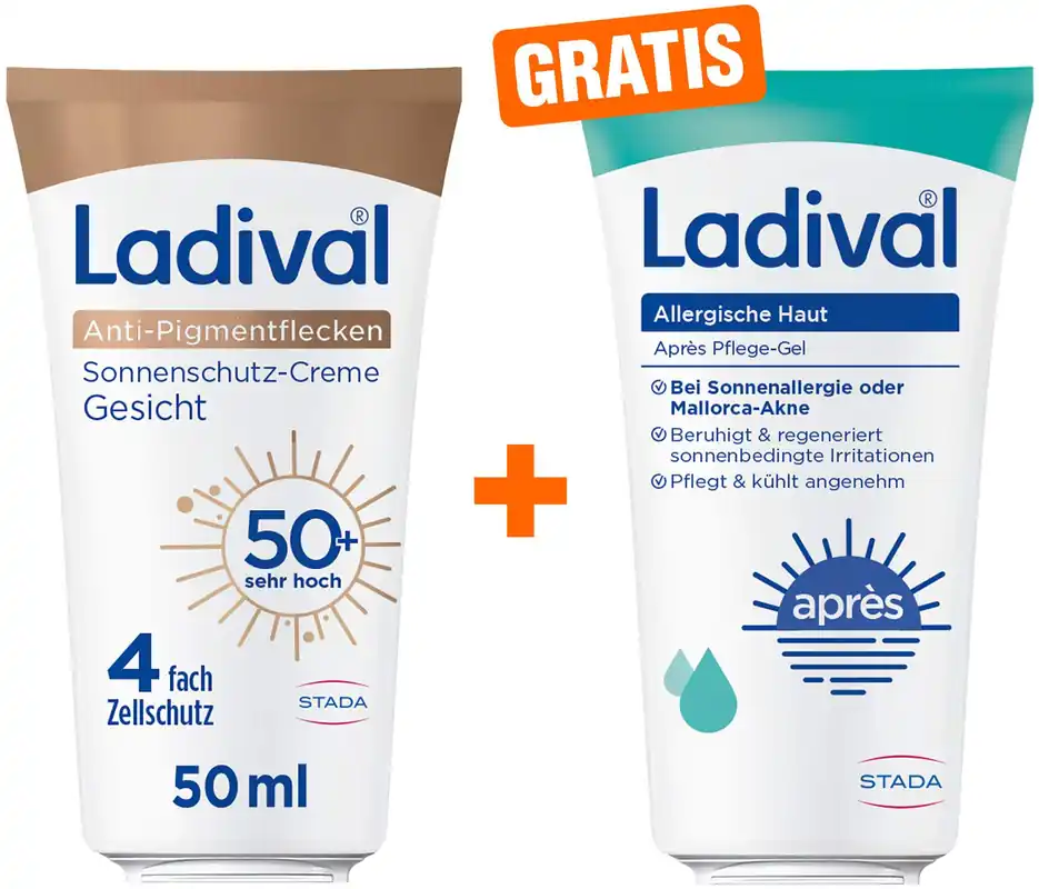Bestpreis Ladival Anti-Pigmentflecken Sonnenschutz-Creme Gesicht LSF 50+ 50 ml + gratis allergische Haut Apres Pflege Gel 50 ml