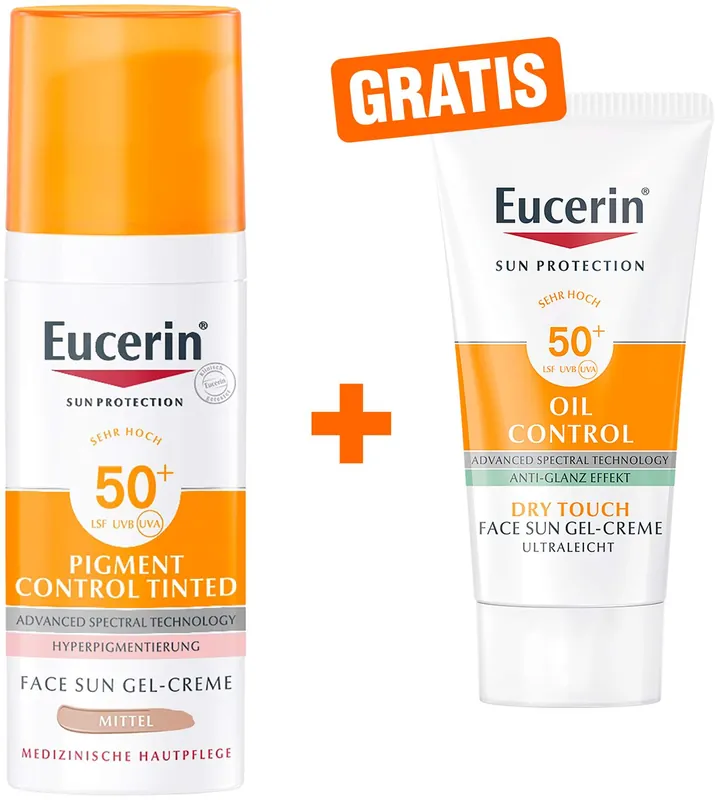 Eucerin Sun Pigment Control Face fluid Getönt (Mittel) LSF 50+ 50 ml + gratis Sun Gel-Creme Oil Control 20 ml Saisonangebot