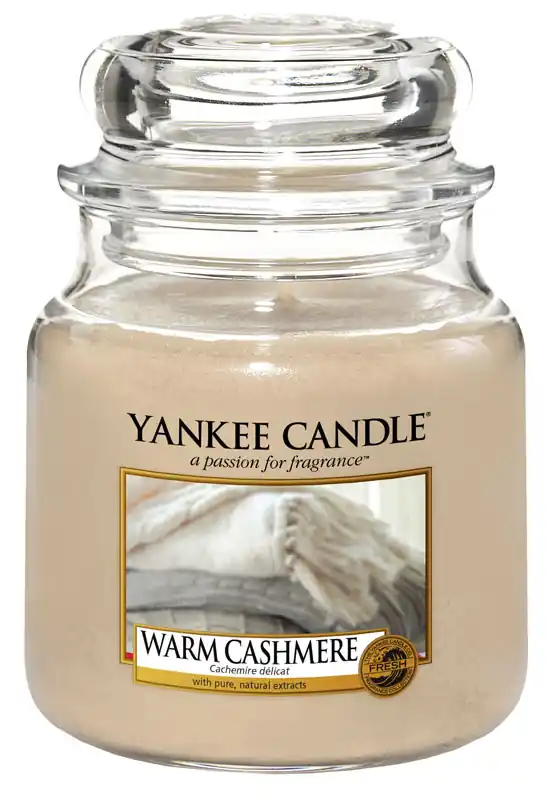 Warm Cashmere Kerze von Yankee Candle – Hüllen Sie sich in puren Luxus mit opulenten Noten von beruhigendem Sandelholz und exotischem Patschuli.
