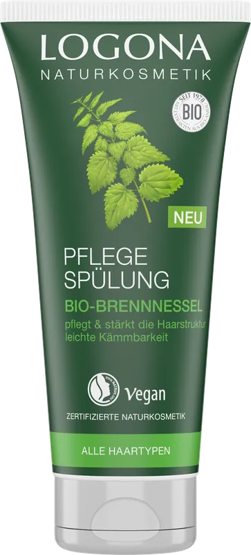 Die LOGONA Pflege Spülung mit der milden Pflege-Formel natürlichen Ursprungs mit Bio-Brennnessel stärkt die Haarstruktur und schenkt gesunden Glanz.