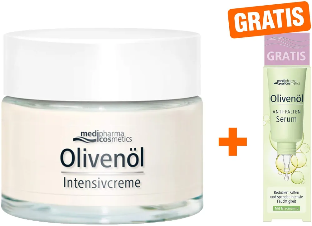 Kostenloser Rückversand medipharma cosmetics Olivenöl Intensivcreme 50 ml + gratis Olivenöl Anti-Falten Serum 5 ml