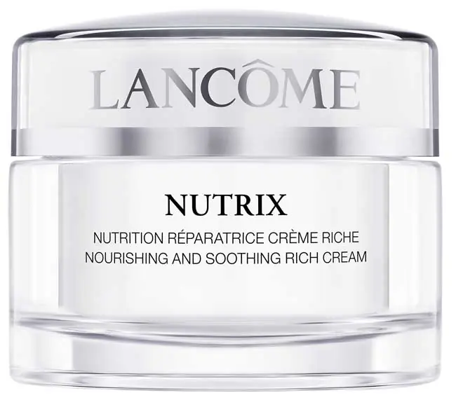Nutrix Face Cream von Lancôme ist eine nährende, beruhigende und reichhaltige Creme. Eine Creme für intensive Feuchtigkeit und reichhaltige Pflege, die Spannungsgefühle der Haut mildert und Problemen trockener oder spröder Haut entgegenwirkt. Regeneriert und gestärkt, erhält die Haut ein einzigartiges Gefühl der Geschmeidigkeit, Frische und Leuchtkraft. Geeignet für trockene, sehr trockene sowie empfindliche Haut.