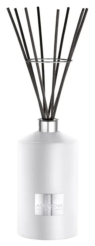Amarena besticht durch seine puristische Schönheit und die wundervoll anschmiegsame Haptik und wird im einzigartigen Flakon aus italienischem Glas, der mit feinstem schneeweißen Samt belegt ist, geliefert, Deckel und Etikett besitzen eine hochwertig gebürstete Aluminiumoberfläche. Die Verwendung von Samt und Aluminium als ansonsten überwiegend im Interior-Bereich eingesetzte Materialen symbolisiert auf elegante Weise die Schnittstelle zwischen Raum und Duft.