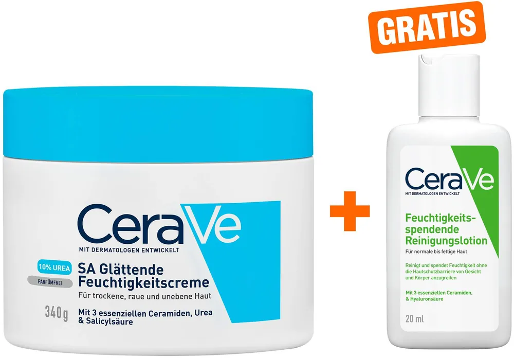 Meistverkauft CeraVe SA Urea Glättende Feuchtigkeitscreme 340 g + gratis Feuchtigkeitsspendende Reinigungslotion 20 ml
