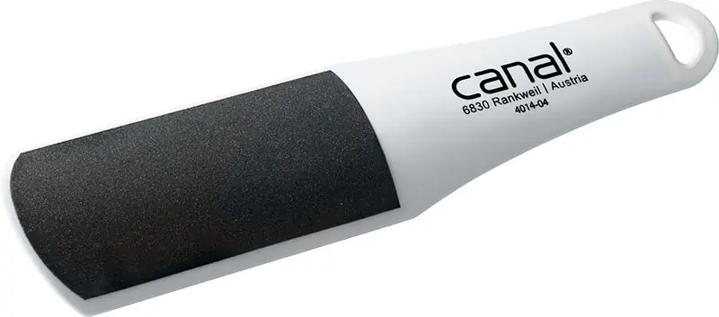 Die Hornhautfeile „fußschmeichler“ von Canal passt sich durch die gebogene Form perfekt dem Fuß an und hat eine fußschmeichelnde Form. Die Feile besteht aus einem stabilen Kunststoffgriff und hat eine grobe und feine Seite. Die Feile hat eine lange Lebensdauer und kann nass und trocken verwendet werden.