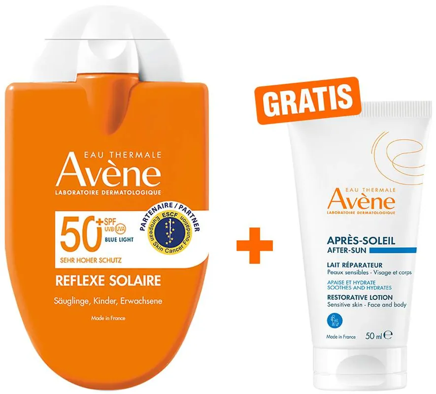 Saisonangebot Avene Reflexe Solaire Familie SPF 50+ 30 ml Fluid + gratis Repair Lotion 50 ml